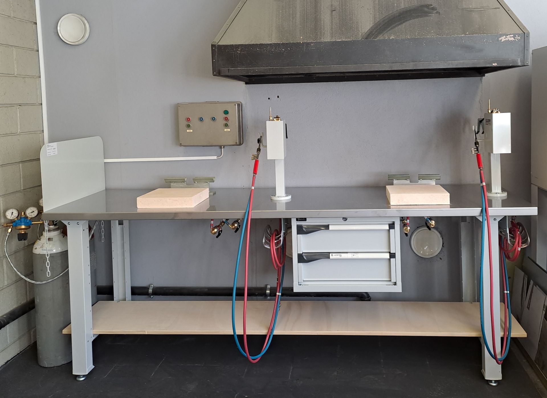 Installation autogène pour atelier d'école, modèle KOMPAKTA 2b, pour brasage, soudage, oxycoupage, chauffage et recuit avec oxygène et acétylène ainsi que brasage à l'acétylène seul. Exécution standard pour deux places de travail.